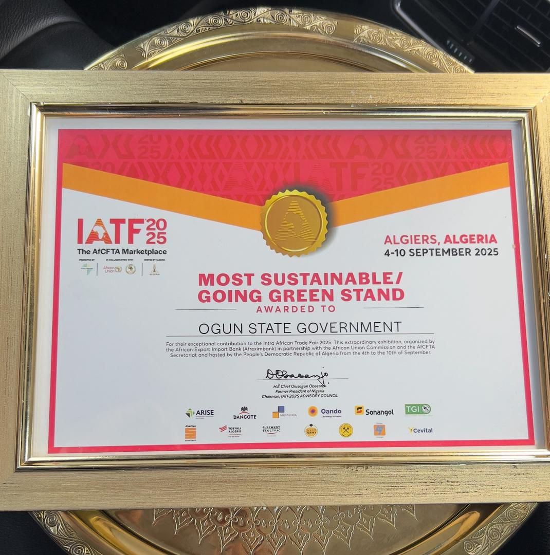 Ogun State, on Wednesday, emerged as the winner of the Most Sustainable Going Green Stand award at the Intra African Trade Fair (IATF) 2025 event held in Algiers, Algeria.